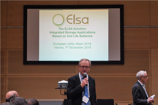 After three years and nine months of joint work, ELSA will finish by the end of 2018. At European Utility Week in Vienna, the ELSA partners gathered with sectoral experts to present the project’s main results, findings and learnings. The event "The ELSA Solution: Integrated Storage Applications Based on 2nd Life Batteries" was held on Wednesday, 7th November. Keynotes featured project coordinator Servan Lacire, EASE Vice President Michael Lippert as well as Renault’s EV Battery Business Director Amaury Galliez. The three very fruitful panel discussions focussed on the topics of integrated storage applications, 2nd life batteries and regulation on battery services & 2nd use of batteries.